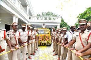 సిబ్బంది నుండి గౌరవవందనం స్వీకరించి వారి నుండిఆత్మీయ వీడ్కోలు తీసుకున్నారు. అనంతరం పోలీసుకవాతు వాహనం లో పెరేడ్ గ్రౌండ్ నుండి ఛాంబర్ వరకు ఎస్పీ గారిని ఓపెన్ టాప్ జీపు పై ఊరేగించి పూలవర్షంకురిపించారు.పోలీసులువాహనాన్నిజిల్లా అధికారులు అందరూ తాళ్లతో లాగి తమ అభిమానాన్ని చాటుకున్నారు.