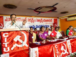 ఈ సందర్బంగా ఆయన మాట్లాడుతూ గత ప్రభుత్వం చట్టసమ్మతం కాని ఎస్మా ను ఎదిరించి 42 రోజులు పోరాడి, సమ్మెకాలానికి కూడా వేతనం సాధించుకున్న ఘనత అంగన్వాడీ సంఘానికి దక్కుతుందని పేర్కొన్నారు. ఎపి మధ్యాహ్న భోజనపధకం వర్కర్ల సంఘ రాష్ట్ర ప్రధాన కార్యదర్శి డి రమాదేవి మాట్లాడుతూ అంగన్వాడీలు అక్కల్లాంటి వారని మధ్యాహ్న భోజన పధకం ఇతర స్కీమ్ వర్కర్ల సమస్యల పరిష్కారం లోను సహకారం అందించాలన్నారు. మహాసభలో వ్యవసాయ కార్మికసంఘం రాష్ట్ర సహాయ కార్యదర్శి కంకణాల ఆంజనేయులు, కేవీపీఎస్ రాష్ట్ర సహాయ కార్యదర్శి బి రఘరాం, ఆల్ రిటైర్డ్ పర్సన్స్ అండ్ పెన్షనర్స్ అసోసియేషన్ జిల్లా కార్యదర్శి జి శేషయ్య సంఘీభావ సందేశం అందించారు. మహాసభలో సంఘ జాతీయ కార్యదర్శి ఏఆర్ సింధు,రాష్ట్ర అధ్యక్ష కార్యదర్శులు జి బేబీ రాణి, కారుసాల సుబ్బరావమ్మ, సీఐటీయూ రాష్ట్ర ప్రధాన కార్యదర్శి సిహెచ్ నరసింగ రావు అన్ని జిల్లాల అధ్యక్ష కార్యదర్శులు ప్రతినిధులు పాల్గొన్నారు.