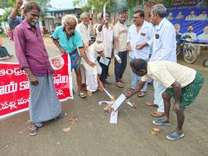 జరుగుమల్లి మండలం చింతలపాలెం గ్రామం లో ప్రజా సంఘాల ఆధ్వర్యంలో అమెరికా అధ్యక్షుడు ట్రంపు భారత వ్యవసాయ ఉత్పత్తుల ఎగుమతుల ఫై విధించిన 50% సుంకలకు వ్యతిరేకంగా నిరసన కార్యక్రమం చేయటం జరిగింది. ట్రంప్ సుంకాల కాపీలను దహనం చేయటం జరిగింది. ఈ సందర్బంగా వ్యవసాయ కార్మిక సంఘం జిల్లా ఉపాధ్యక్షుడు వి. మోజెస్ మాట్లాడుతూ అమెరికా అధ్యక్షుడు ట్రంపు భారతదేశ వ్యవసాయ ఉత్పత్తుల ఫై సుంకాలు విధించటం దుర్మార్గం అని అన్నారు. ఇది భారత ప్రజల ఫై పెను భారాలు మోపుతుంది అని ఆవేదన వ్యక్తం చేశారు. ఇది భారత దేశ ఆర్థిక వ్యవస్థ ను దెబ్బ తీసే కుట్ర అని తెలిపారు. సీఐటీయూ జిల్లా ఉపాధ్యక్షులు టీ. రాము మాట్లాడుతూ భారత దేశ ఎగుమతుల ఫై సుంకాలు విదిస్తే మోడీ మౌనంగా ఉండటం అన్యాయం అని అన్నారు. ఇది భారత దేశ కార్మిక వర్గం పైన తీవ్ర ప్రభావం చూపుతుంది అని అన్నారు. ట్రంప్ విధించిన సుంకాలను వెంటనే రద్దు చేయాలని డిమాండ్ చేశారు. దీని పైన కేంద్ర, రాష్ట్ర ప్రభుత్వాలు స్పందించక పోతే ప్రజలు తగిన బుద్ది చెబుతారు అని హెచ్చరిక చేశారు. ఈ కార్యక్రమం లో టీ. సుబ్బారావు, జీ. అంకయ్య, బి. శివయ్య, కేవీ. శేషయ్య, బి. రమణయ్య, టీ. నారాయణరావు, ఇ. ఏసుబాబు, కె. యలమంద తదితరులు పాల్గొన్నారు..
